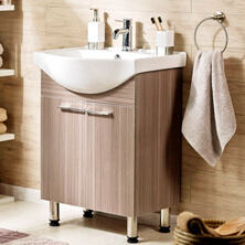Um modelo de toucador, que tem uma coluna para apoiar a pia, mas também aproveita sua forma para incorporar prateleiras, geralmente de vidro, e toalheiro. Esse modelo tem menos espaço de armazenagem do que os demais toucadores, mas na prateleira pode guardar acessórios de limpeza básicos. São ideais para o banheiro de hóspedes.