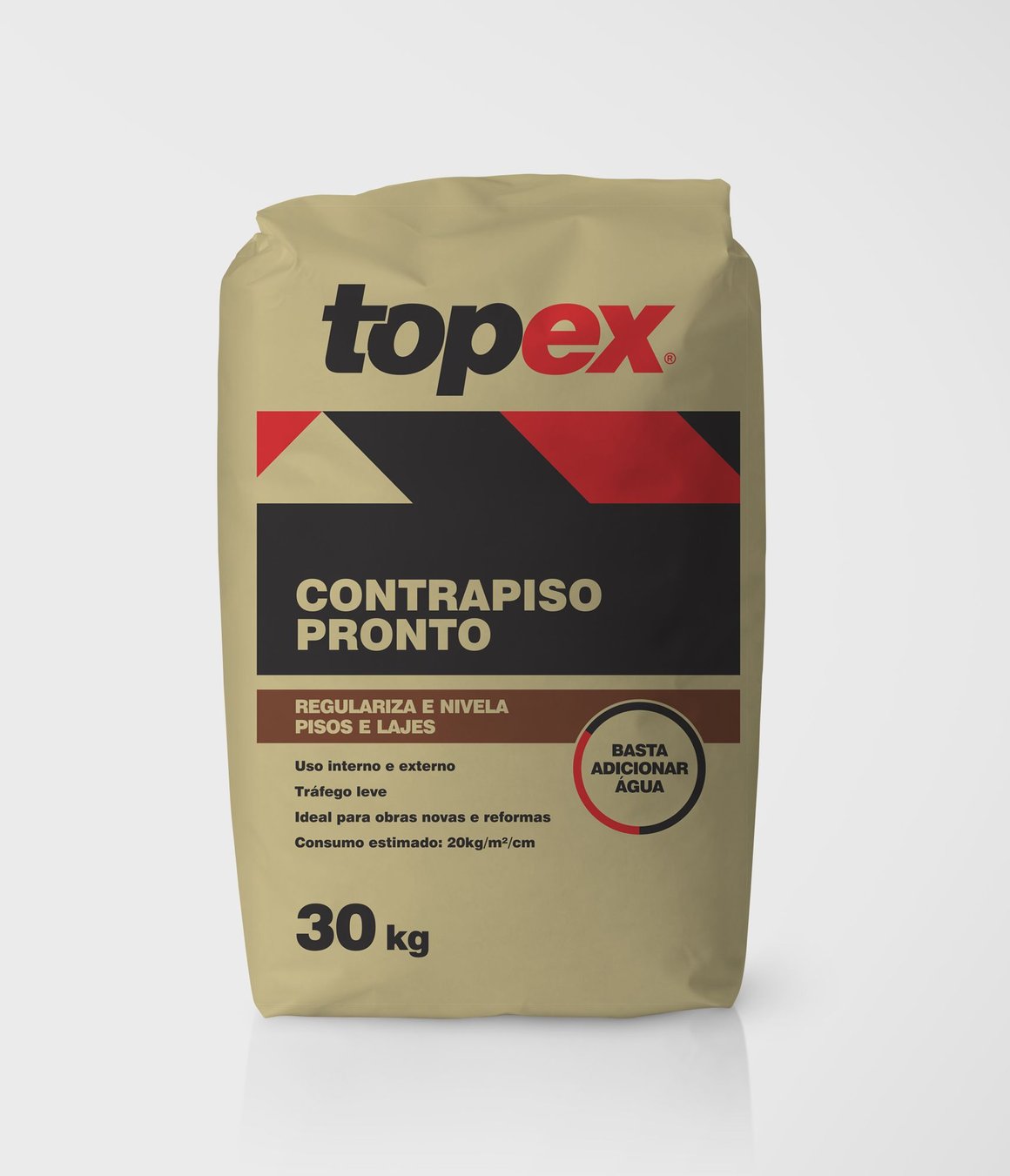 O Contrapiso Pronto 30kg Cinza da Topex é um produto nacional, com peso líquido de 30kg e peso bruto de 30,27kg. Sua composição é feita de cimento Portland e agregados minerais, garantindo alta resistência e durabilidade. O produto é de fácil aplicação e possui um consumo estimado de 20kg/m², ideal para uso interno e externo, em tráfego leve.